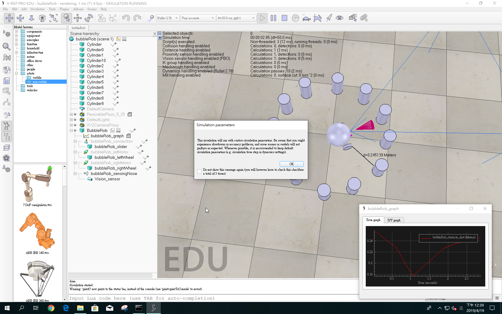 這週開始模擬 V-rep ,中間我遇到一些問題,都是同組的組員教我的或告訴我在哪裡。又因為是英文,所以我花了四堂課才把實習任務2老師給的東西翻譯完模擬出來。但在模擬的時候會出現一個東西,希望之後可以找到原因。下課後我幫一個同組也不太會的組員模擬,雖然有做出來,但是因為一些東西更改錯誤,所以影響最後模擬出來的結果,最後是請老師幫忙找錯誤,我才知道我主從設定錯誤而影響組員的東西不能正常移動,後來又發現我沒有把名字改對,所以不能跟程式中的名稱應對,才使得我第二次模擬出來的東西一直怪怪的,不能正常移動。